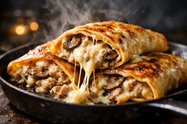 Ces crêpes salées trouvent facilement leur place au dîner, quand on a envie d’un plat chaud, rassurant et sans complication. Le thon et les champignons forment une garniture douce et généreuse, liée par la crème et le fromage qui fond lentement à la poêle. Une recette pratique, pensée pour les soirs pressés comme pour les repas à partager